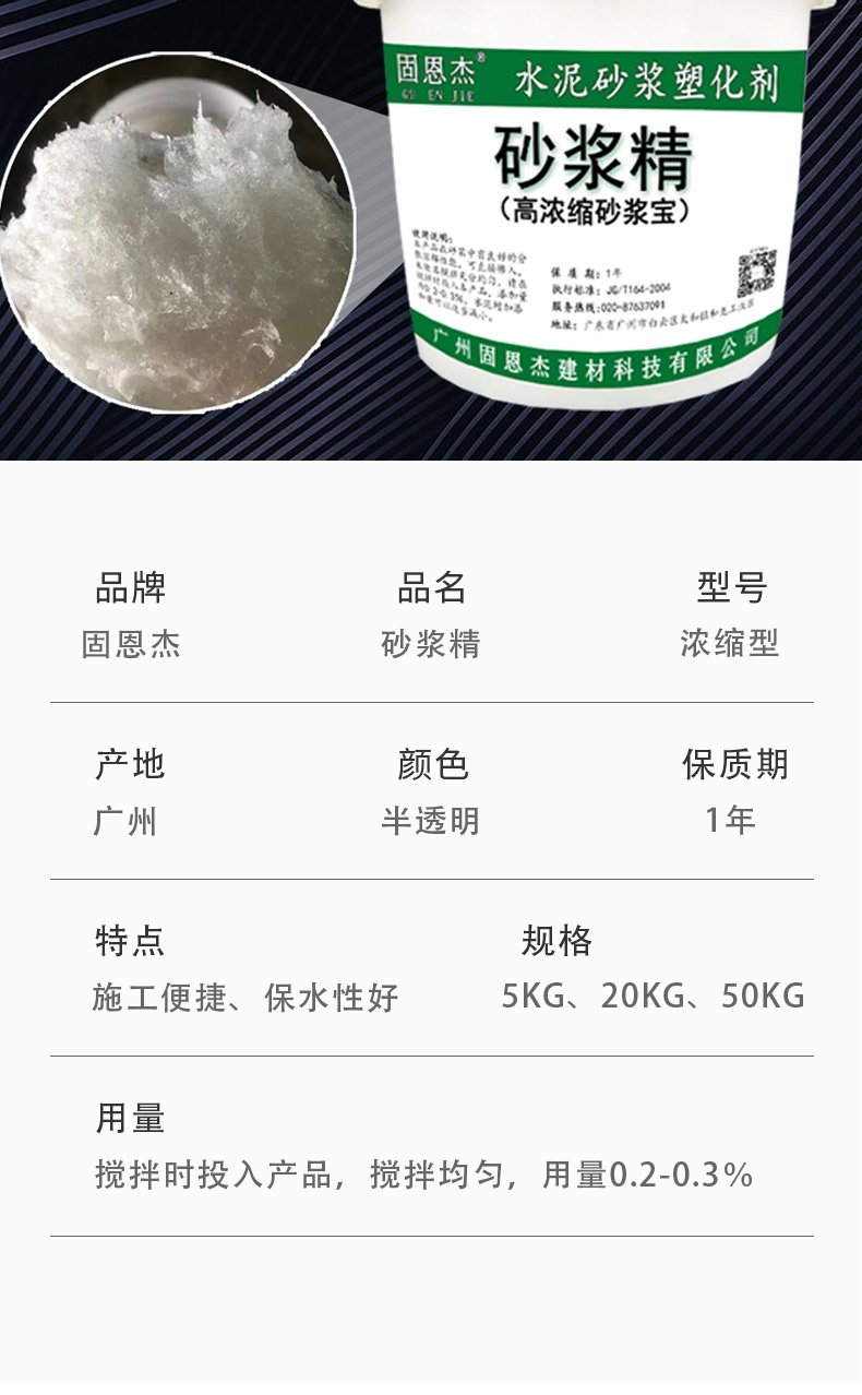 品牌:固恩杰 規格:18KG 型號:濃縮型 保質期:6月 生產地:廣州 特色服務:免費樣品 產品名稱:砂漿精 特點:減少施工強度,保水性強。