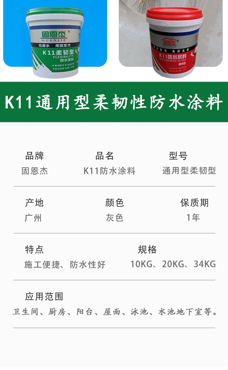 品牌:固恩杰 規(guī)格:20KG 型號:柔韌型通用型 保質(zhì)期:12月 生產(chǎn)地:廣州 特色服務(wù):免費樣品 產(chǎn)品名稱:K11防水涂料、廚衛(wèi)防水涂料 應(yīng)用范圍:衛(wèi)生間、廚房、屋面、水池、地下室、陽臺、天溝、外墻等